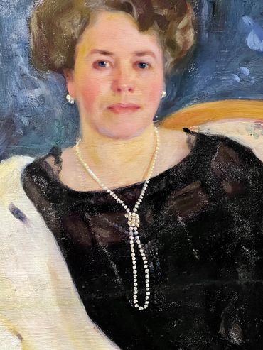 Дар'я Добріян: Мабуть, улюбленим елементом Мурашка були перли. Сьогодні вони можуть здаватися дуже скромними, але ми розуміємо, що це натуральні перли. У нас на виставці в Київській картинній галереї є два портрети з різницею у чотири роки — це різні жінки, але на обох ми бачимо тонкі перлові намиста.